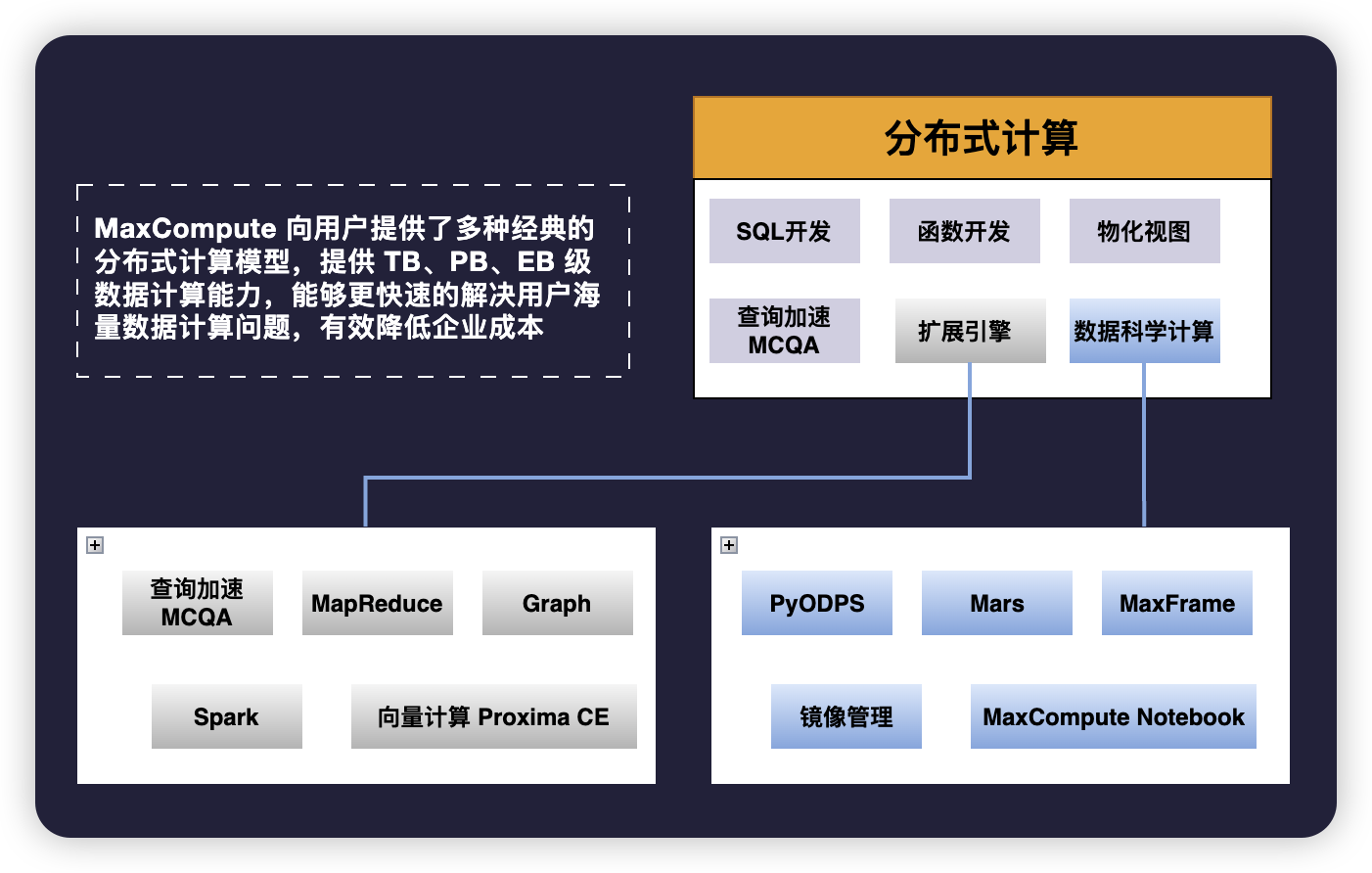 - 集成AI能力:与人工智能平台 PAI无缝集成,提供强大的机器学习处理能力,可使用Spark-ML开展智能分,可以使用Python机器学习三方库