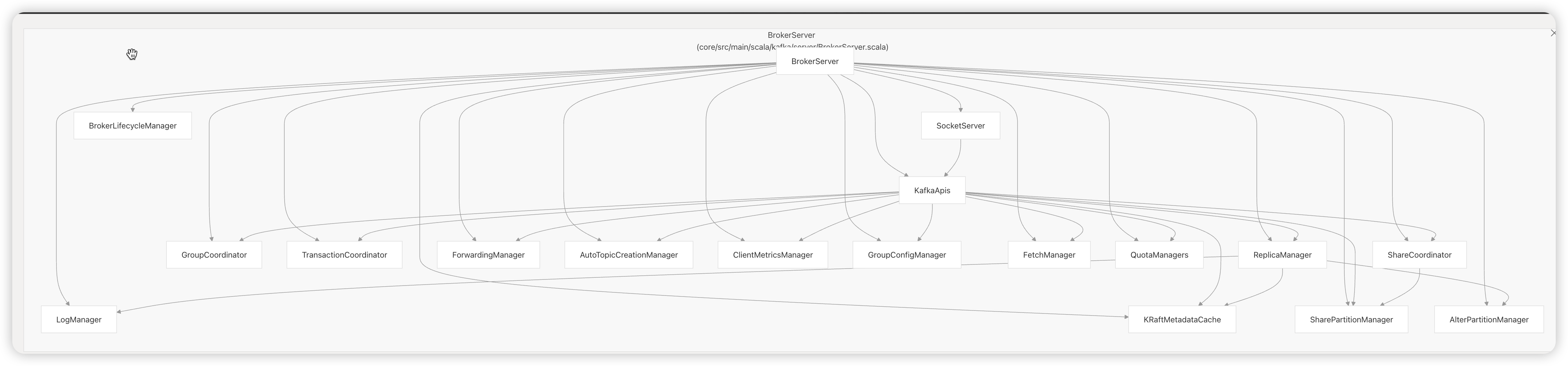 A Kafka broker is a server process that handles client requests, stores and replicates messages, and participates in cluster coordination. Each broker runs a set of core components, each implemented as a class or subsystem in the codebase.