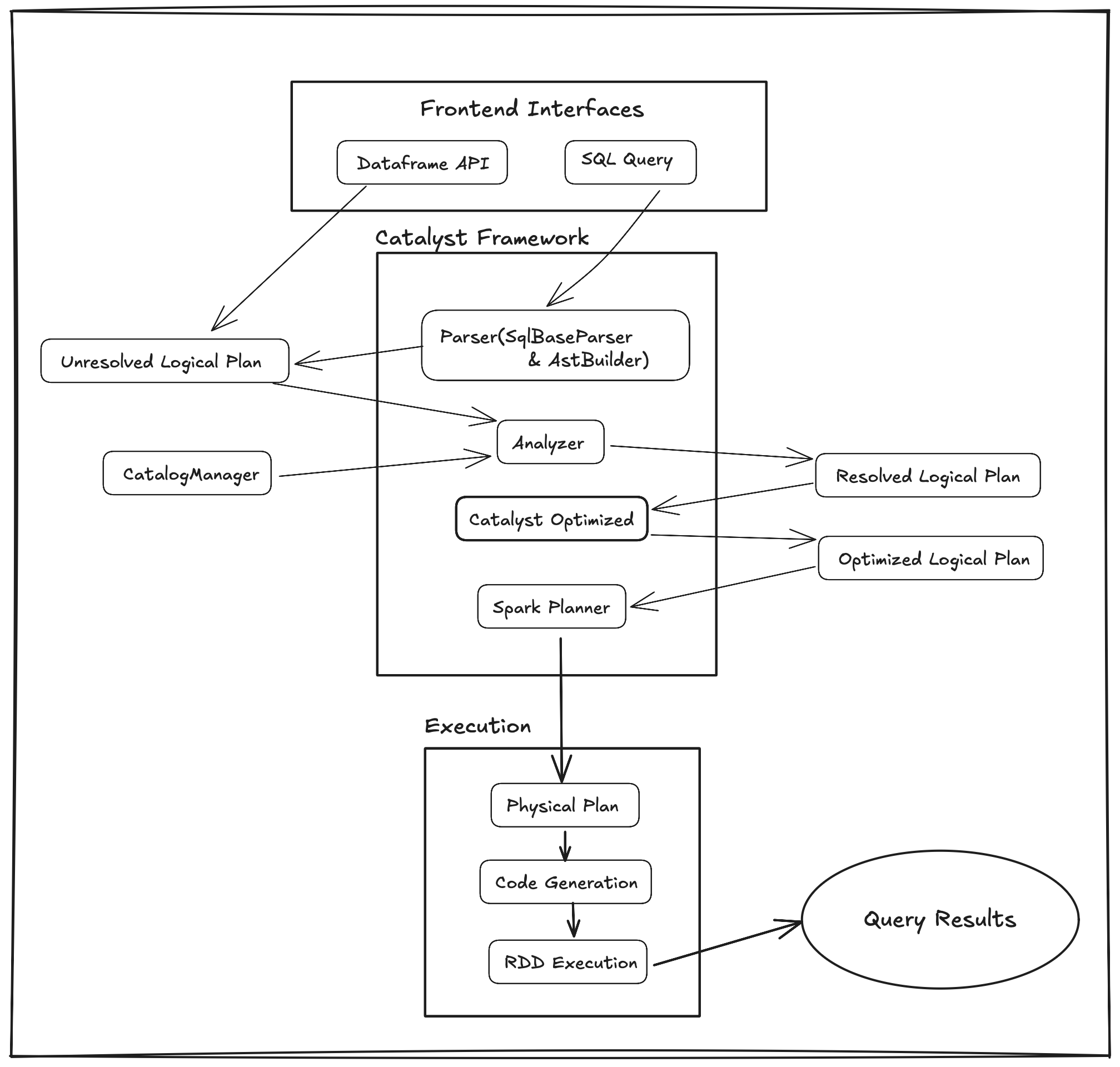 Spark SQL’s architecture consists of several key components that work together to process structured data: