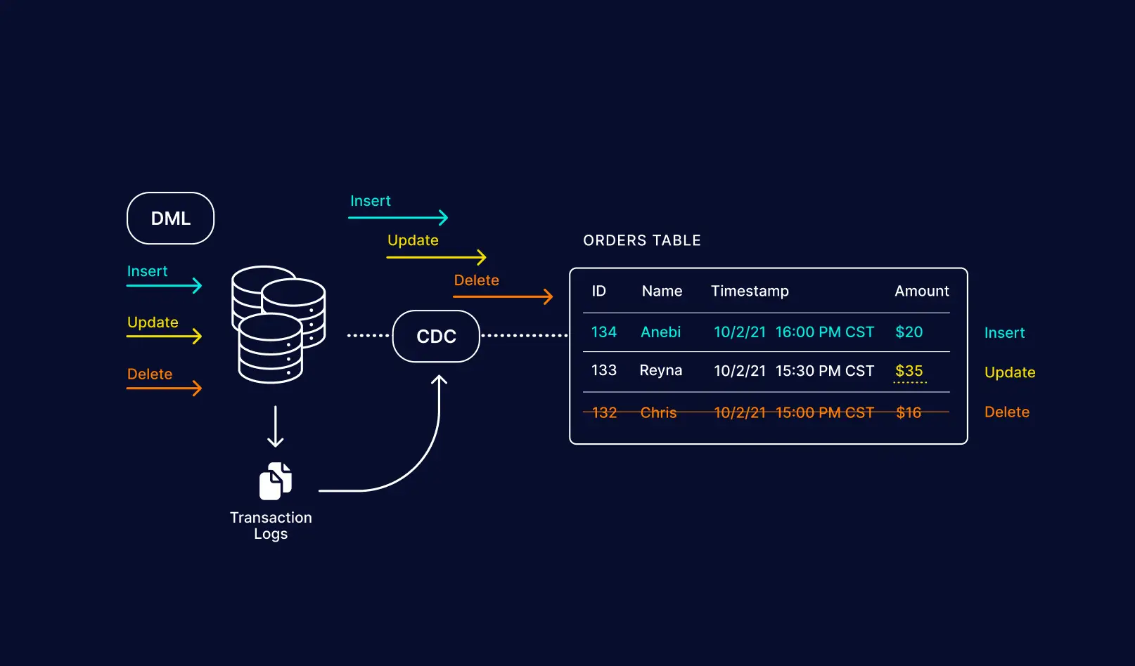 Change data capture describes the process of recording the change of data in a database. Typically, this means tracking when records are inserted, updated, and deleted along with the data itself.